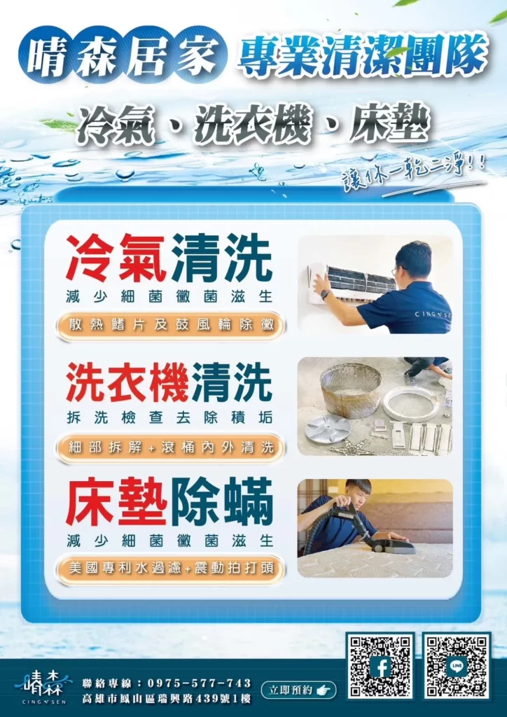 晴森居家 是您生活的好鄰居 關於我們 高雄專業清洗冷氣洗衣機、除塵蟎、到府服務 歡迎來到晴森居家,您居家生活的好鄰。我們是專業從事冷氣、洗衣機和除塵蟎解決方案的公司,致力於為您營造一個舒適、清新的居家環境。晴森居家,不僅是一個服務提供者,更是您居家生活值得信賴的夥伴。我們追求卓越,致力於為您營造一個舒適、健康的生活空間。 清潔重要性 你知道 冷氣 及 洗衣機 是需要定期清潔的嗎? 小心過敏、皮膚炎找上門!! 冷氣和洗衣機是需要定期清潔的家電設備,以確保它們的正常運作並減少可能導致過敏或皮膚炎的風險。 冷氣清潔 01 濾網清潔定期清潔或更換冷氣的濾網,以避免灰塵和空氣中的污染物進入室內空氣。 02 冷氣清潔定期請專業技師進行冷氣內部的清潔和維護,以確保冷氣能夠有效運作,同時減少空氣中的細菌和黴菌。 洗衣機清潔 01 滾筒清潔定期清潔洗衣機內外滾筒,以防止積聚在其中的灰塵和纖維,並確保排水順暢。 02 橡膠密封圈清潔檢查並清潔洗衣機的橡膠密封圈,以防止霉菌和細菌的滋生。 03 定期清洗機內部使用洗衣機清洗劑,並結合細節刷和高壓水柱進行徹底清洗。 最新活動 冷氣清洗 💦 不分機型全面優惠中最低只要$1500 老闆加碼再送優惠 洗一台折$100 洗兩台單台折$200 洗三台含以上單台折$300 預約洗冷氣兩台含以上加碼送床墊除塵蟎一次! 想讓冷氣煥然一新嗎?趕緊底下預約清洗!歡迎公司行號洽談預約!量多優惠享不完! 服務項目 分離式冷氣 $1,800 $1,800 窗型式冷氣 $2,500 $2,500 吊隱式冷氣 $2,500 $2,500 落地箱式冷氣 $2,500 $2,500 直立式洗衣機 $1,500 $1,500 滾筒式冷氣 $3,000 $3,000 除塵蟎 以上免費洗室外機,需在安全施工環境下,如因社區規定或環境因素不能洗就沒法清洗 以上冷氣在餐飲營業場所如重油汙+500 預約流程 01 說明清潔需求 02 預約施工時間、地點 03 到府清潔服務 04 周圍環境維護 05 專業清洗施作 06 機台效能檢測 07 環境恢復 施工案例 冷氣清潔 洗衣機清洗 除塵蟎 地址|高雄市鳳山區瑞興路439號 電話|0975-577-743 統編|93303417 Facebook-f Instagram Line